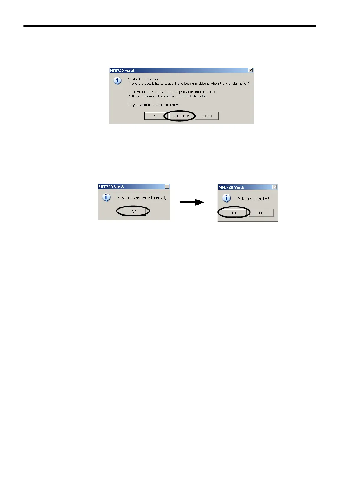 The MP2300 will stop running and MPE720 will start transferring the selected sample program files. When the