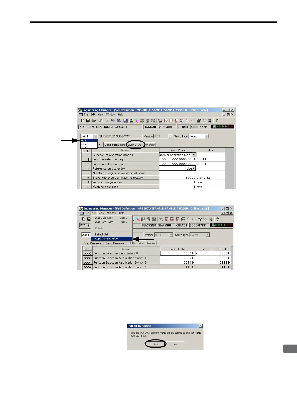 The data in the Input Data Column is the SERVOPACK data saved to the MP2300 and the data in the Current