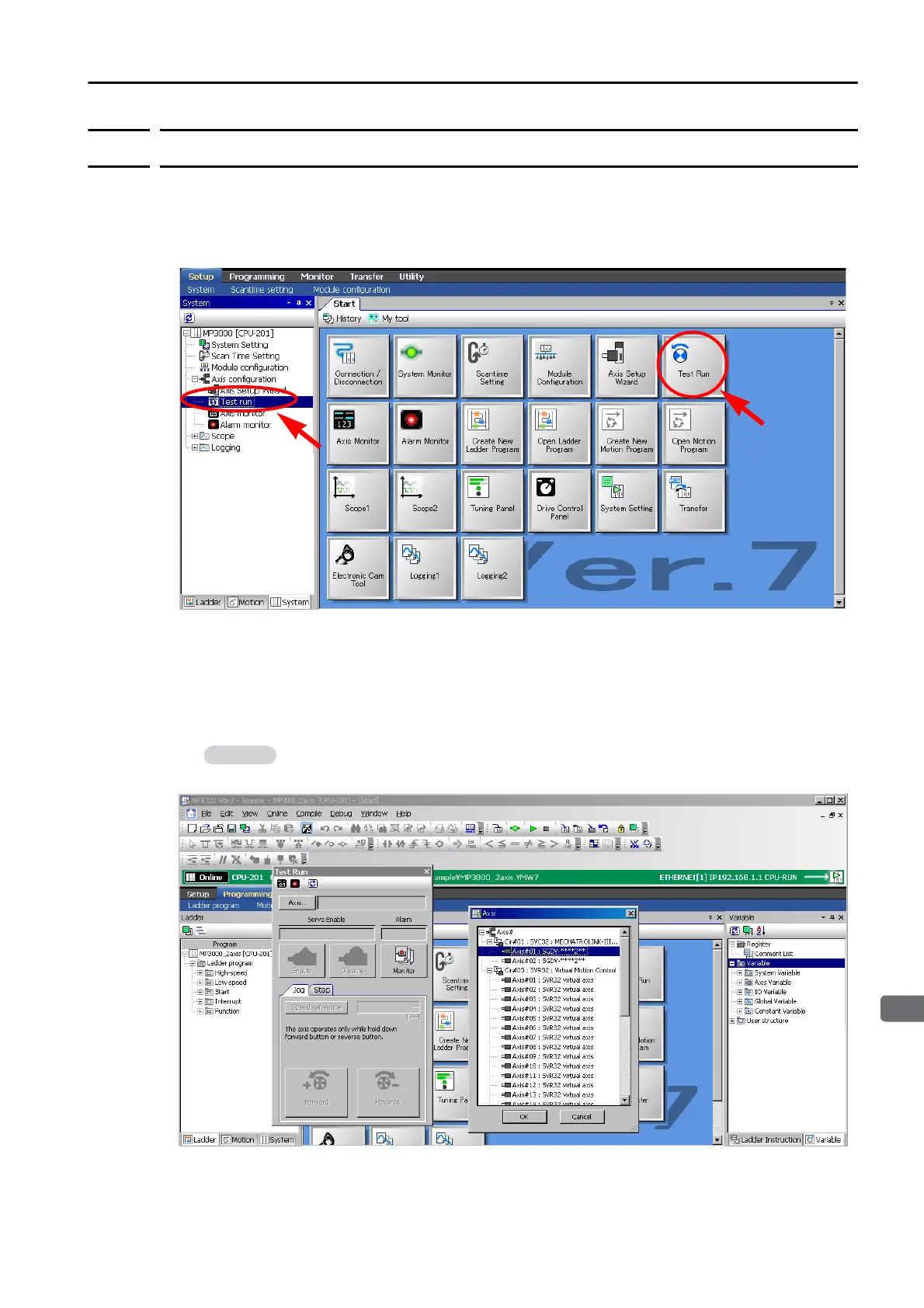 Next, the Test Run Dialog Box and the Axis Selection Dialog Box will be displayed.