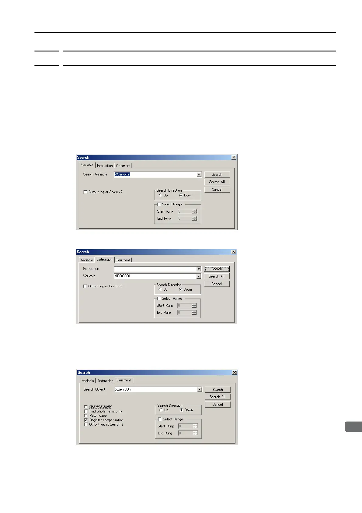 Bring the program to search to the front in the Ladder Editor, and then select Edit − Find