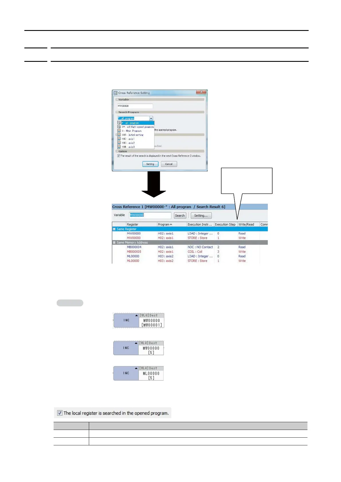 Selected. A search is made for local registers (D registers) in the active drawing in the MPE720 Window.