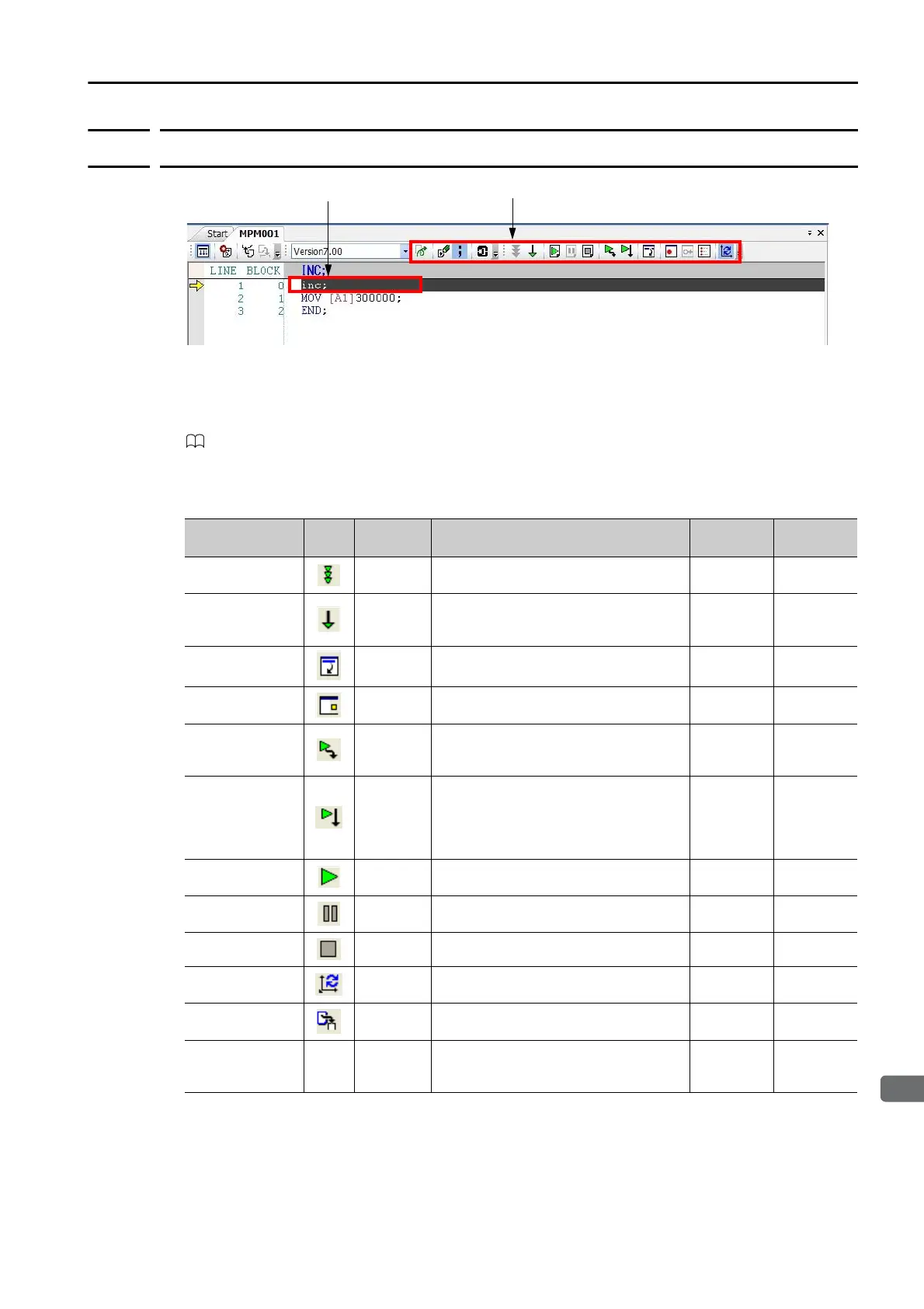 If an alarm has occurred in the motion program, the line will be displayed in red. Refer to the