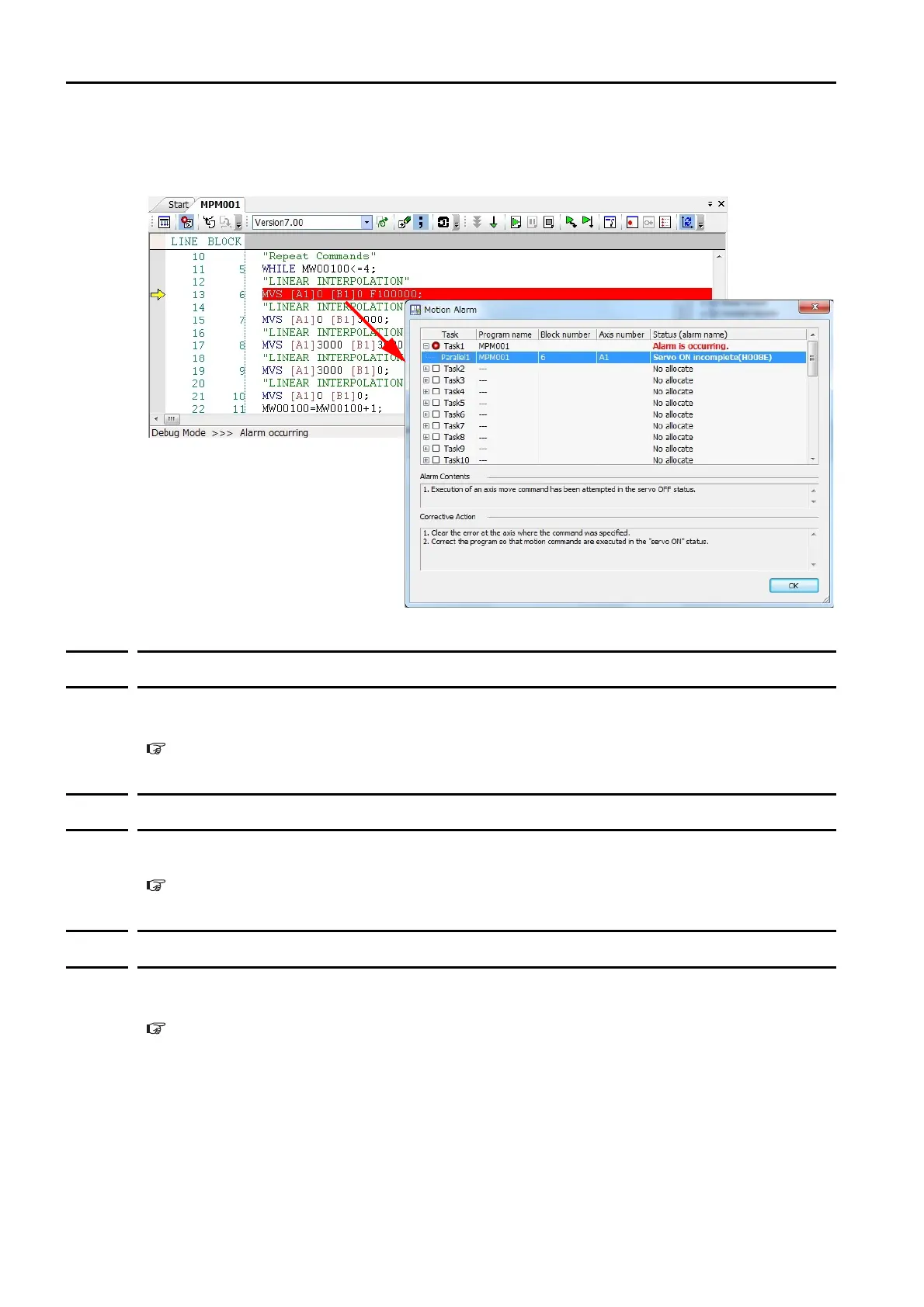 If an alarm occurs in the motion program during execution, the line that is being executed will