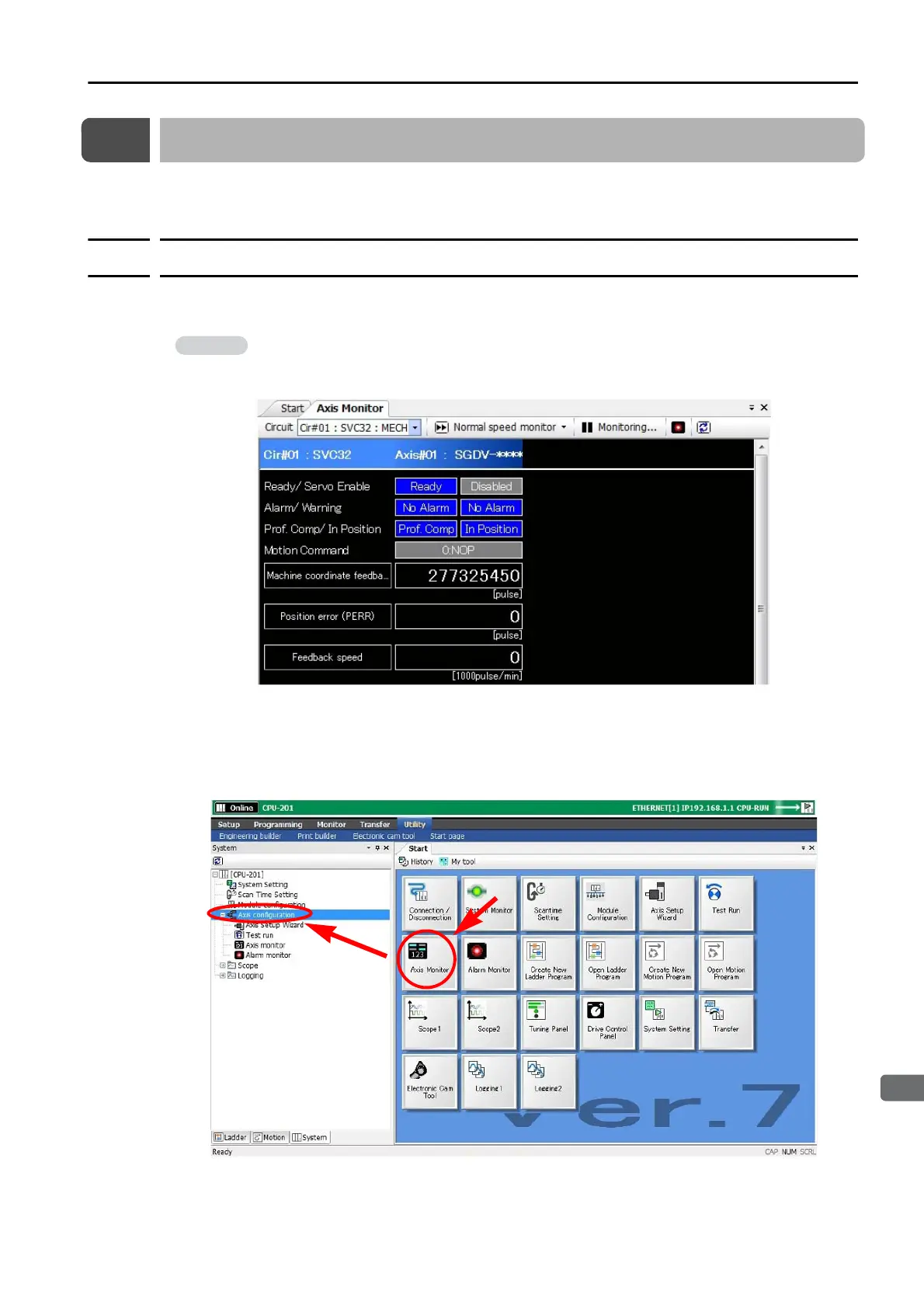 You can use the Axis Monitor Tab Page to check the Ready/Servo ON status (“Ready/Servo
