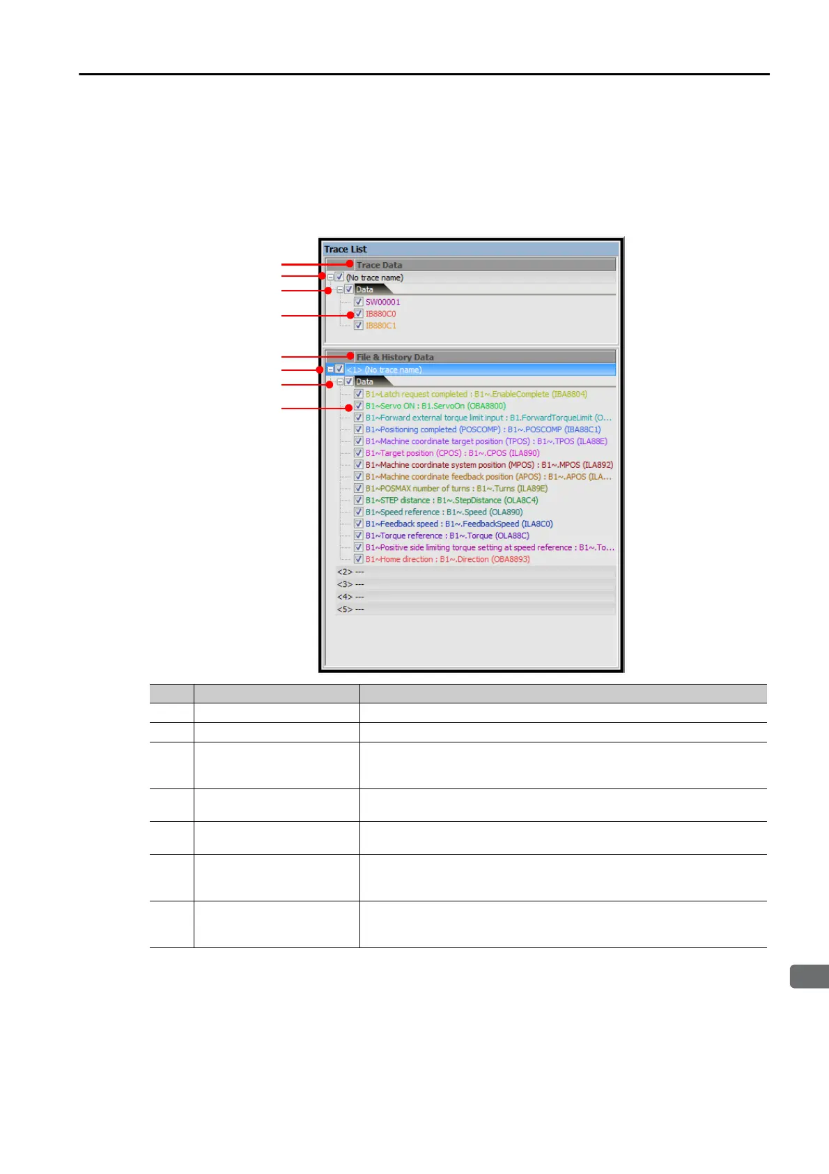 The Trace List displays the traced data, the trace data that was read from external files, and a