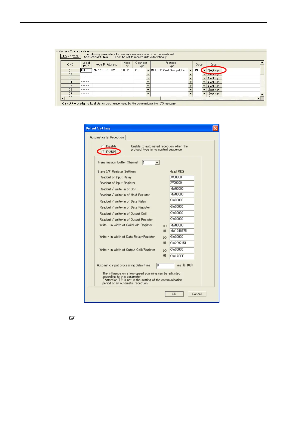2. Disable automatic reception for any connection for which message functions (MSG-SNDE and MSG-