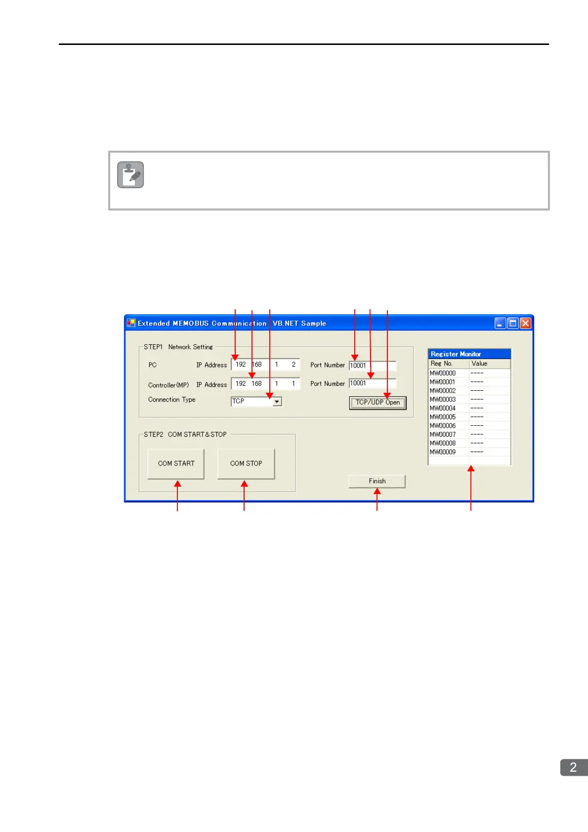 When communications starts, the sample application reads 10 words from the MW00000 to MW00009