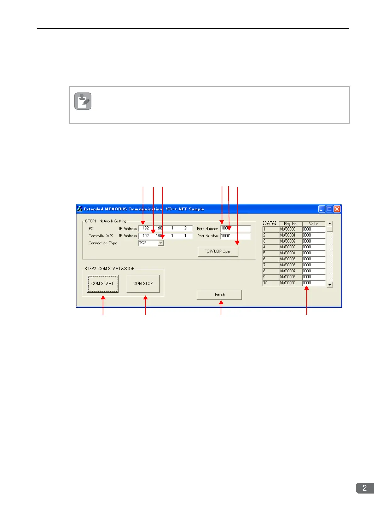 When communications starts, the sample application reads 10 words from the MW00000 to MW00009