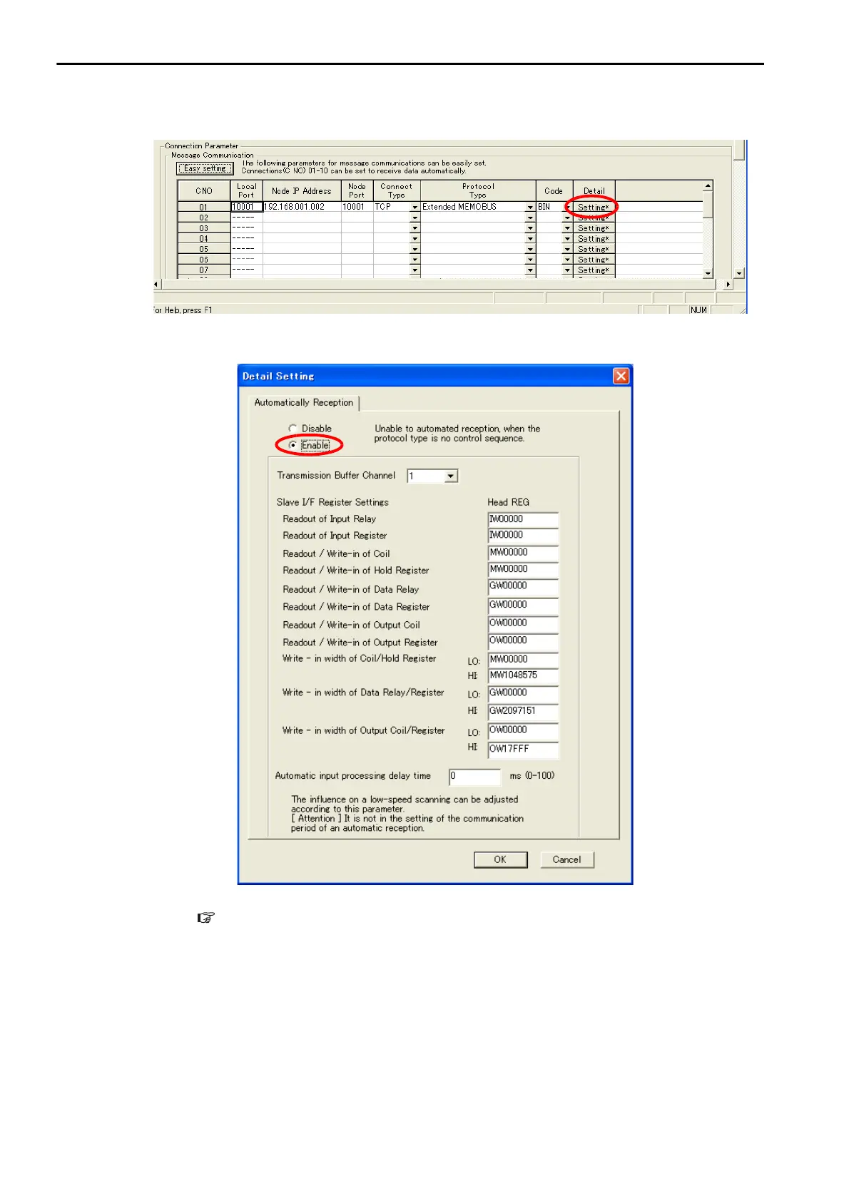 2. Disable automatic reception for any connection for which message functions (MSG-SNDE and MSG-