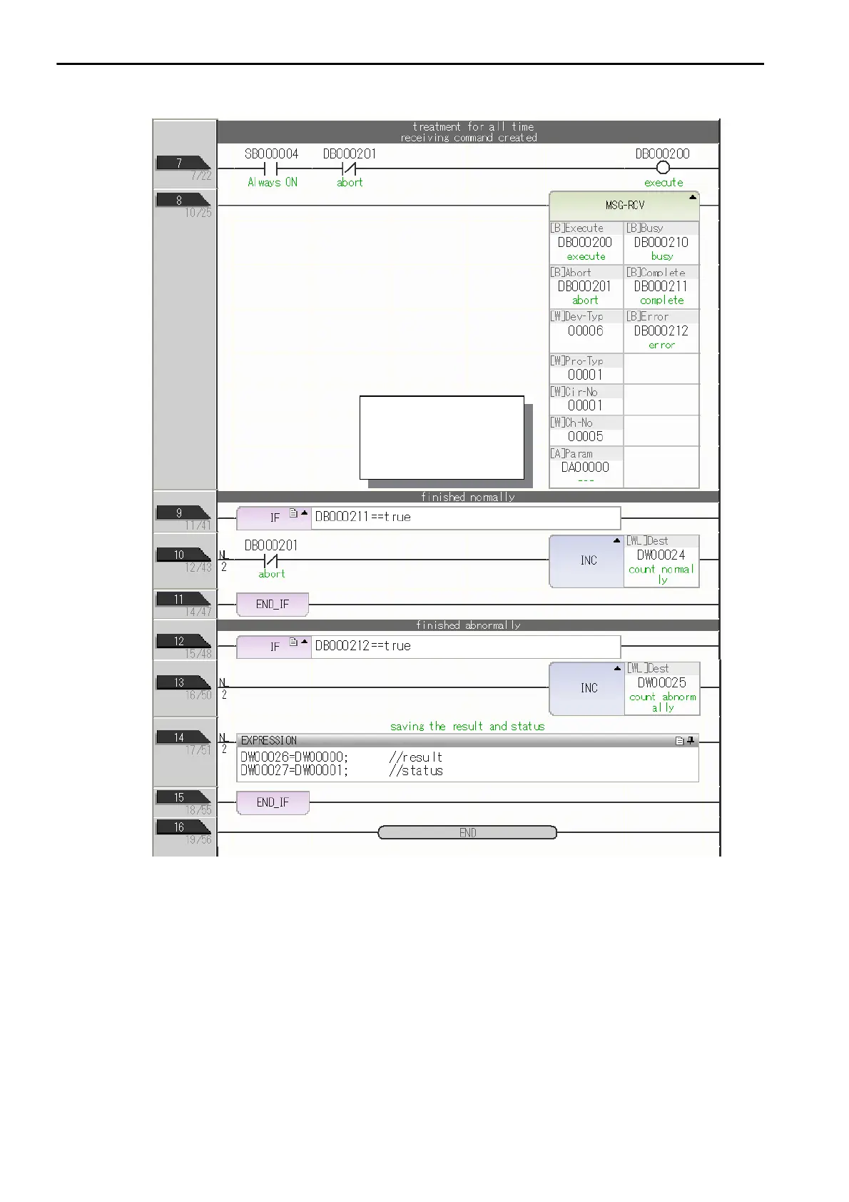 In the ladder program example, message reception starts immediately after the system starts. No further