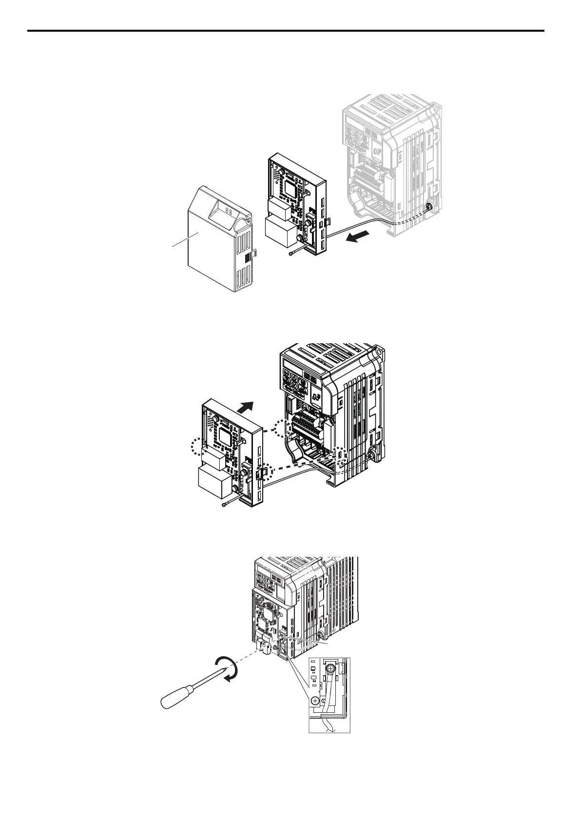 20. For IP20/Open-Chassis or IP20/UL Type 1 enclosure models, attach the option to the drive. Properly seat the