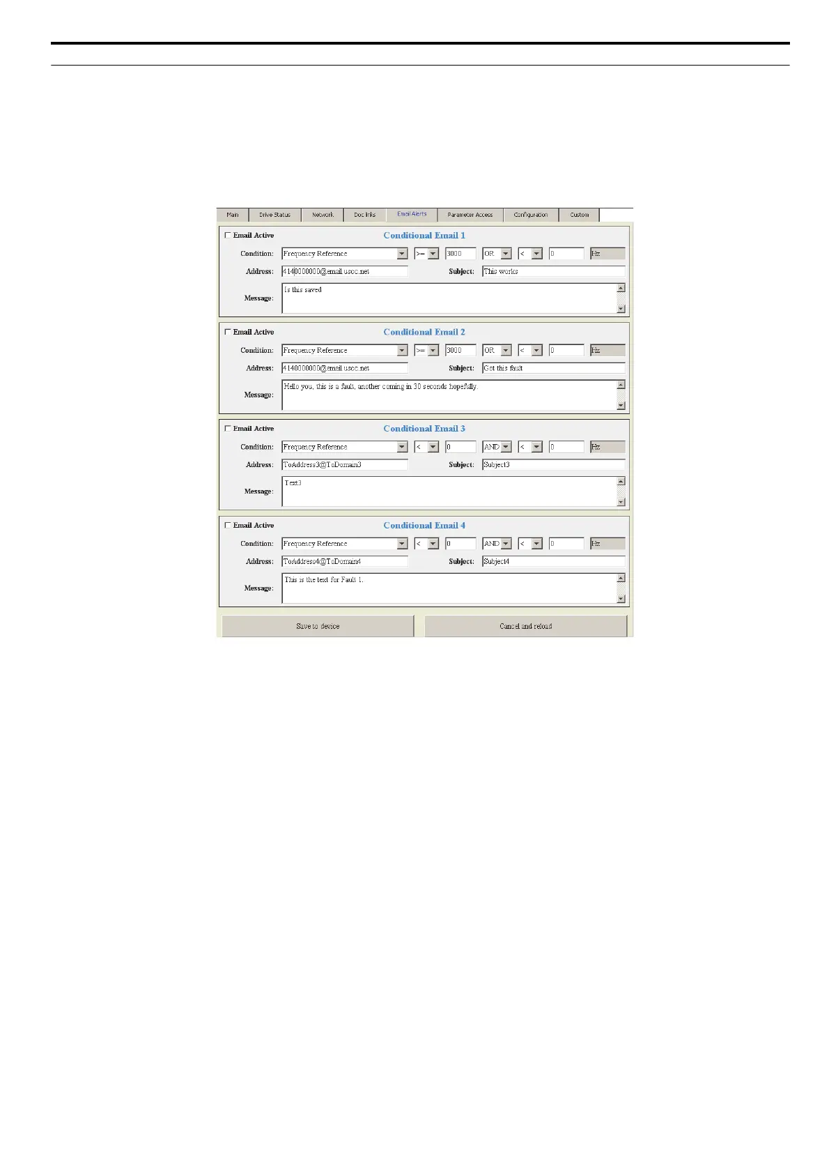 The Email Alerts tab allows the user to configure four Email Fault/Alarm conditions. When the condition is true, one