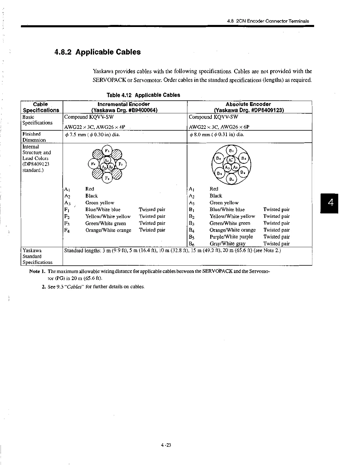 Yaskawa provides cables with the following specifications. Cables are not provided with the