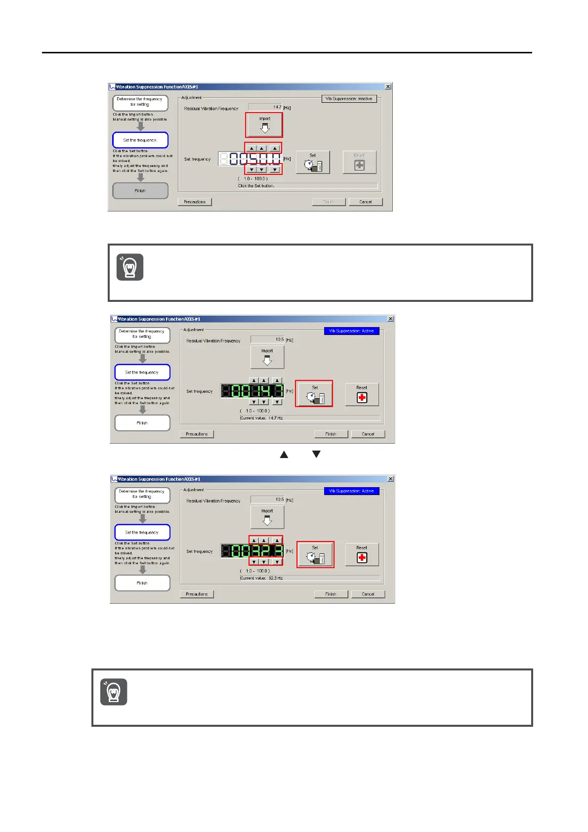 If the vibration is not eliminated, use the and Buttons for the set frequency to fine-tune the