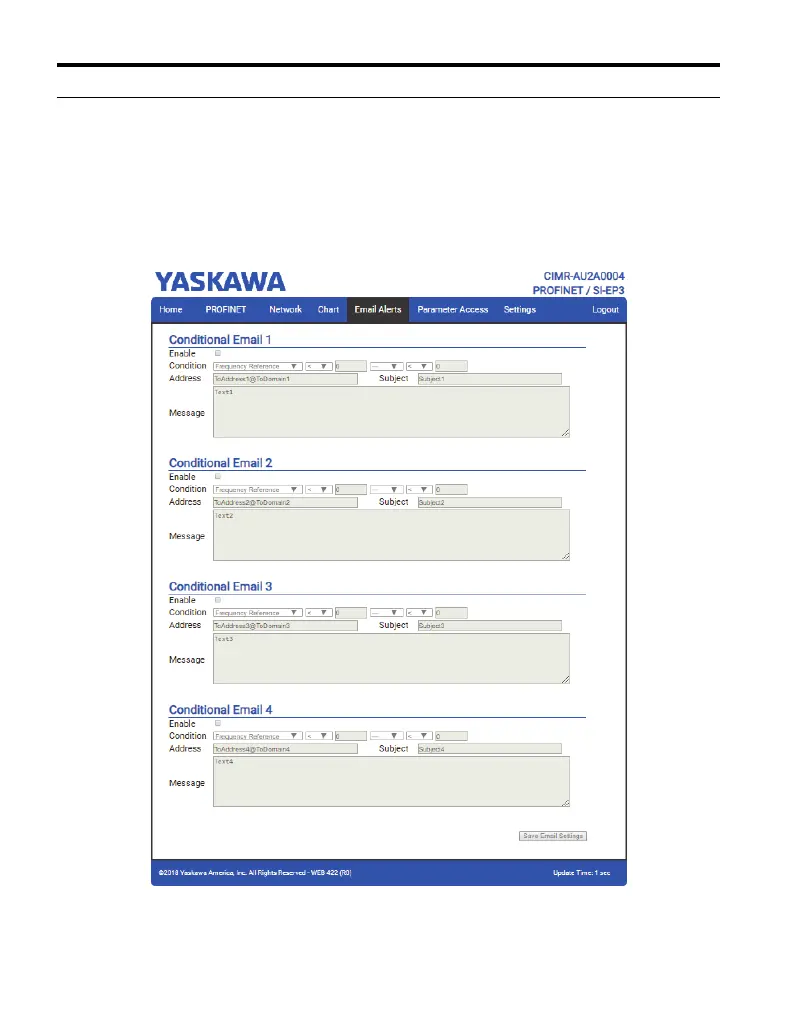 The Email Alerts page allows the user to configure four Email Fault/Alarm conditions.