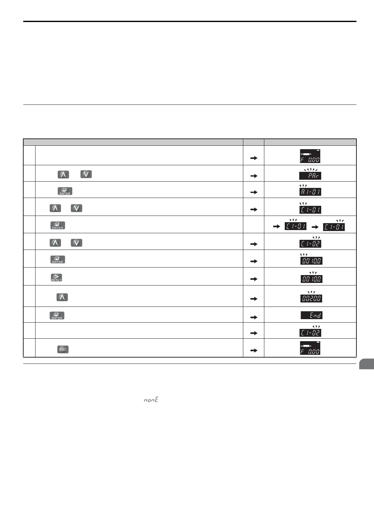 This example explains changing C1-02 (Deceleration Time 1) from 10.0 seconds (default) to 20.0 seconds.