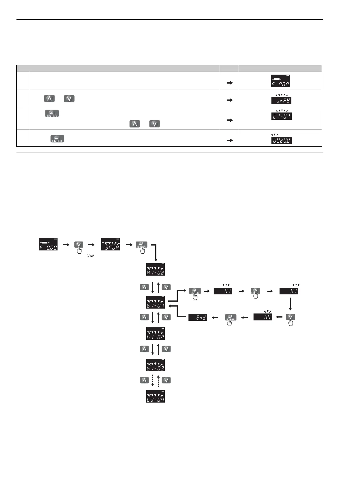 The following example is a continuation of the steps above. Here, parameter C1-02 is accessed using the Verify Menu,