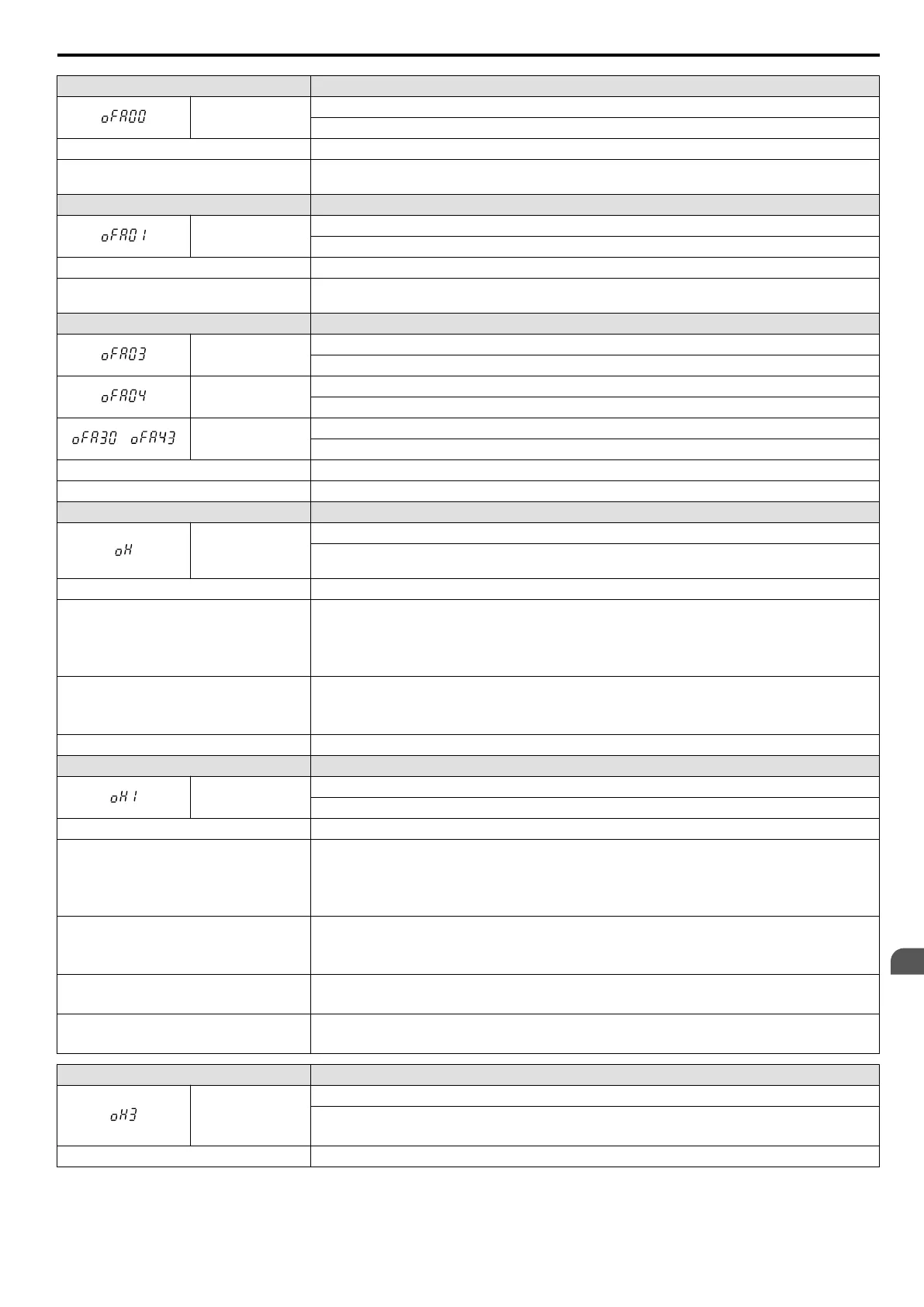 Internal cooling fan is stopped. • After replacing the drive, reset the cooling fan maintenance parameter (o4-03 = “0”).