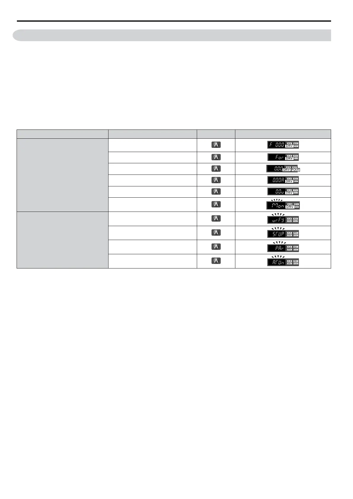 Table 4.3 illustrates the different functions visible as the “Up arrow” is scrolled immediately after powering up the drive.
