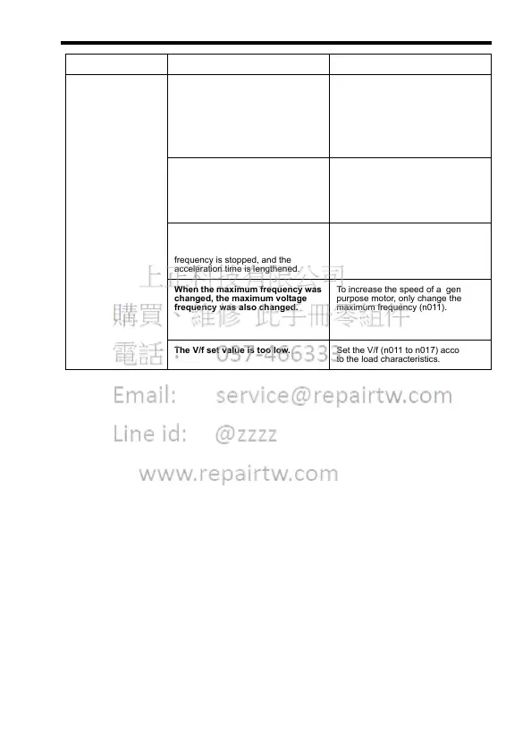 The V/f set value is too low. Set the V/f (n011 to n017) according