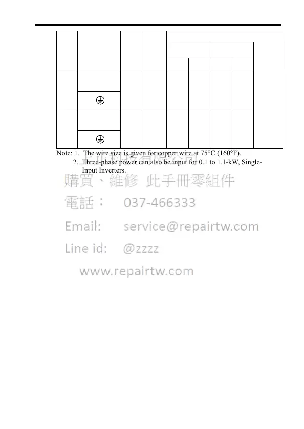 Note: 1. The wire size is given for copper wire at 75°C (160°F).