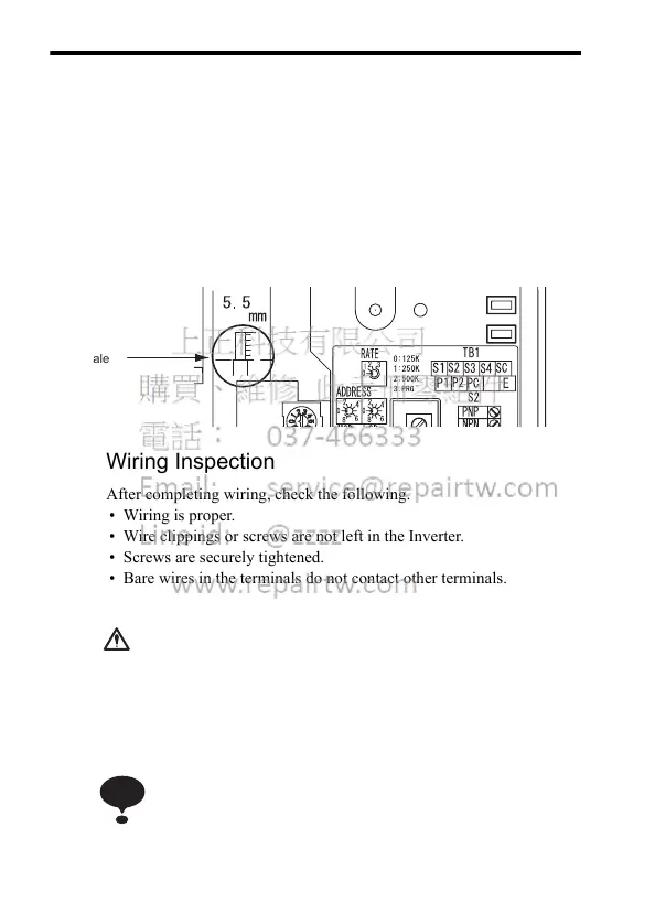 • Wire clippings or screws are not left in the Inverter.