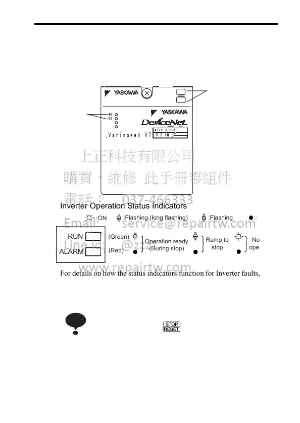 the status of the Inverter and DeviceNet communications (On, flashing,