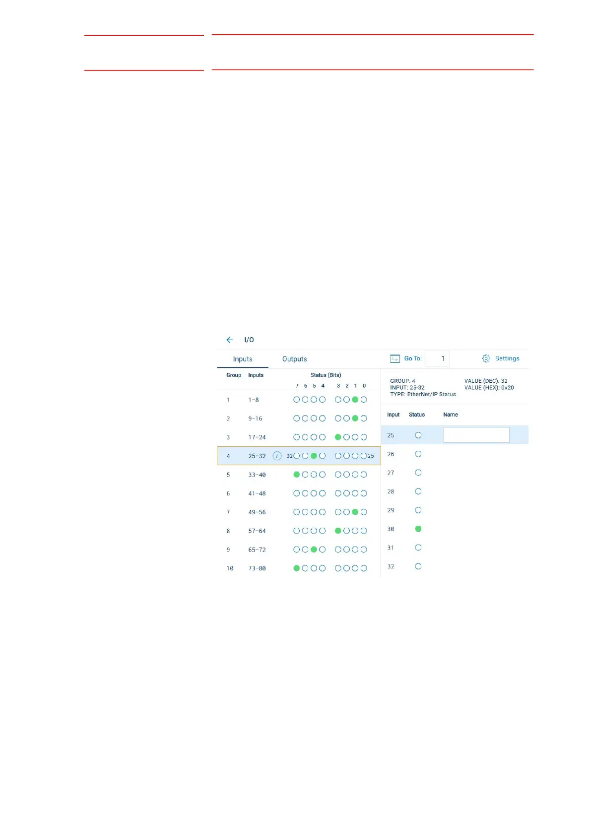 warning box surrounding the EtherNet/IP Status byte in the {Inputs} panel.