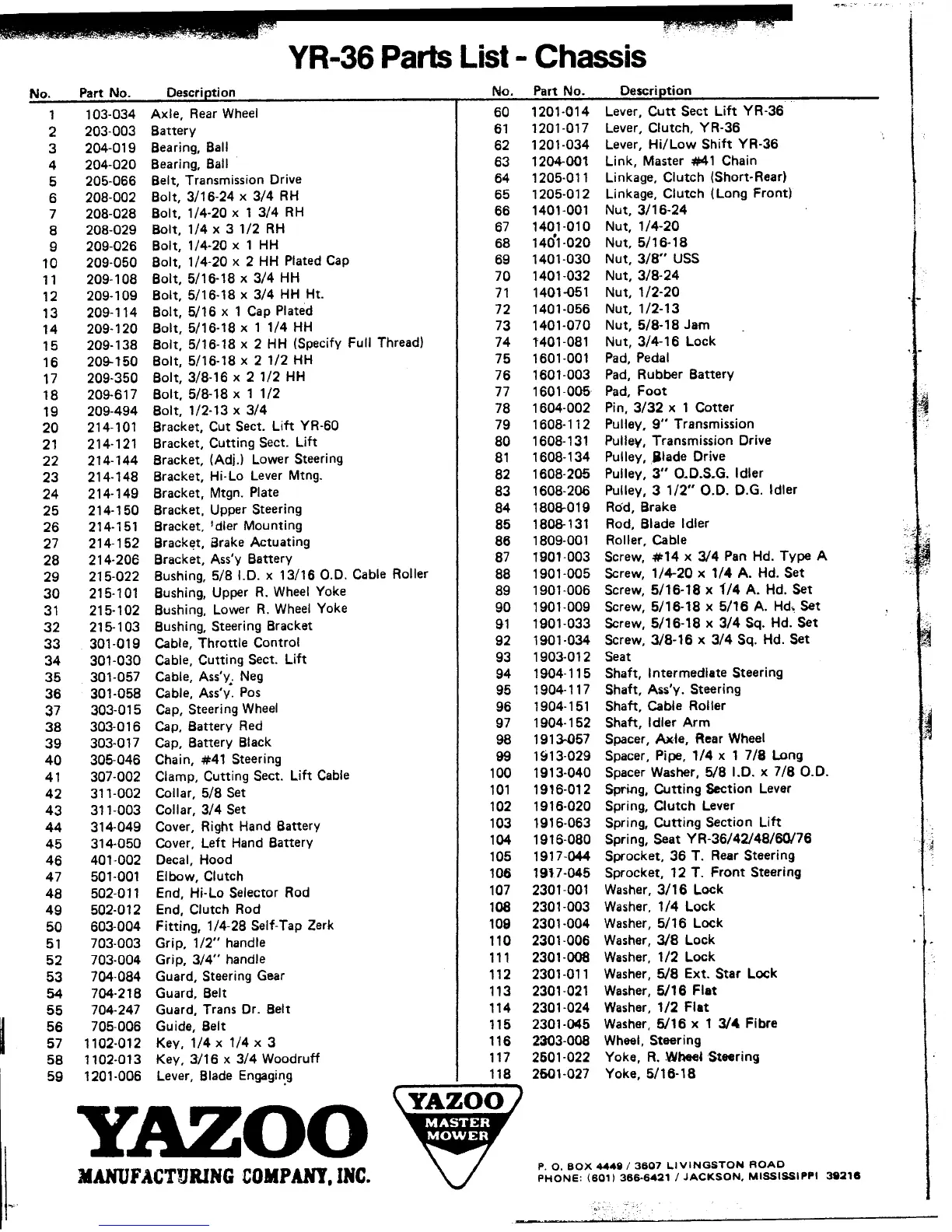 1 103-034 Axle, Rear Wheel 60 1201-014 Lever, Cutt Sect Lift YR-36