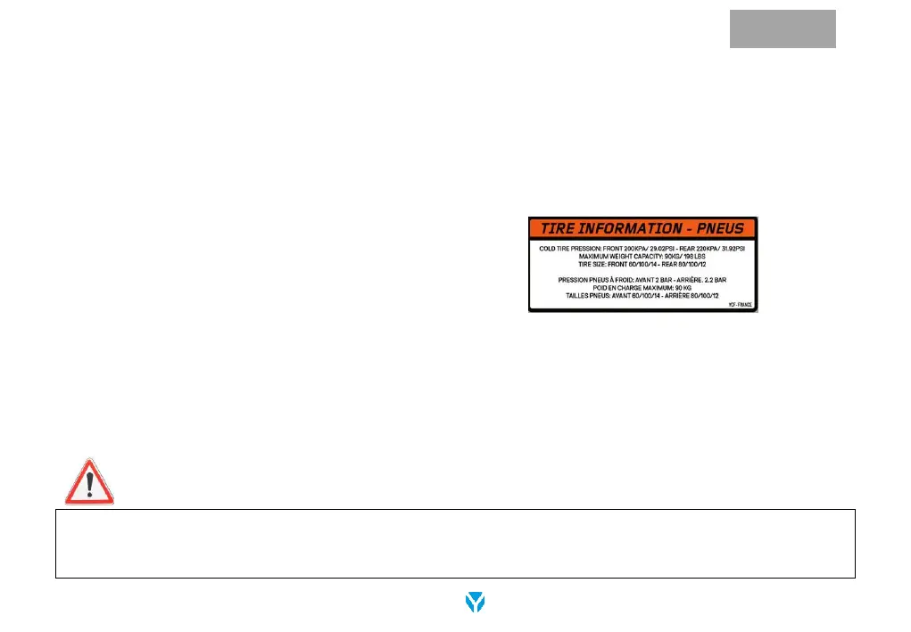 Before riding, always check the wear of the tires and verify the absence of crevices and fissures, protruding