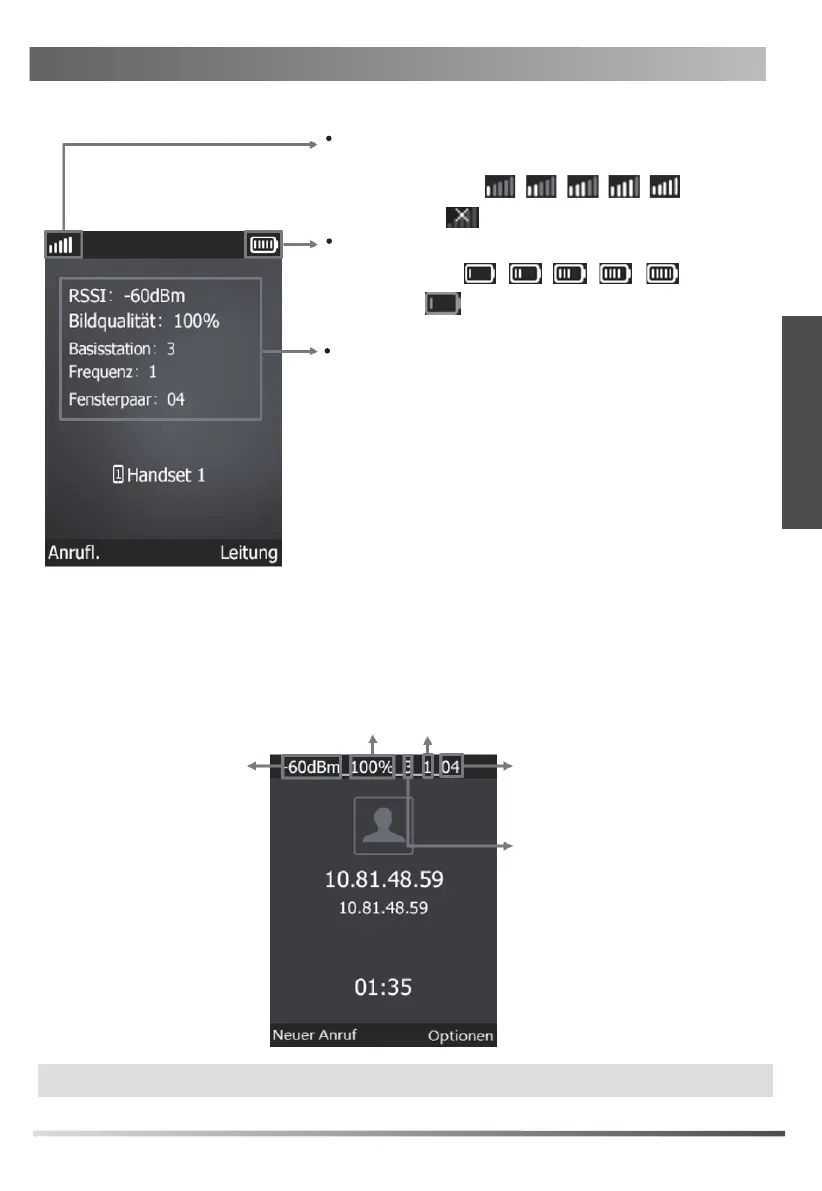 Ist der Gesprächsbildschirm am Mobilteil aktiv, werden die Messdaten am oberen Rand angezeigt.