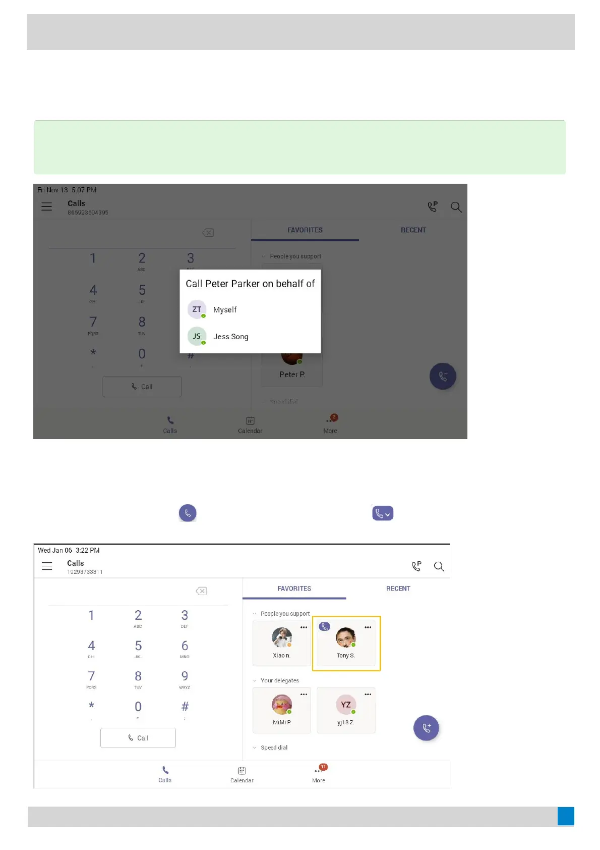The delegate can place a call either on their behalf or on behalf of the boss.