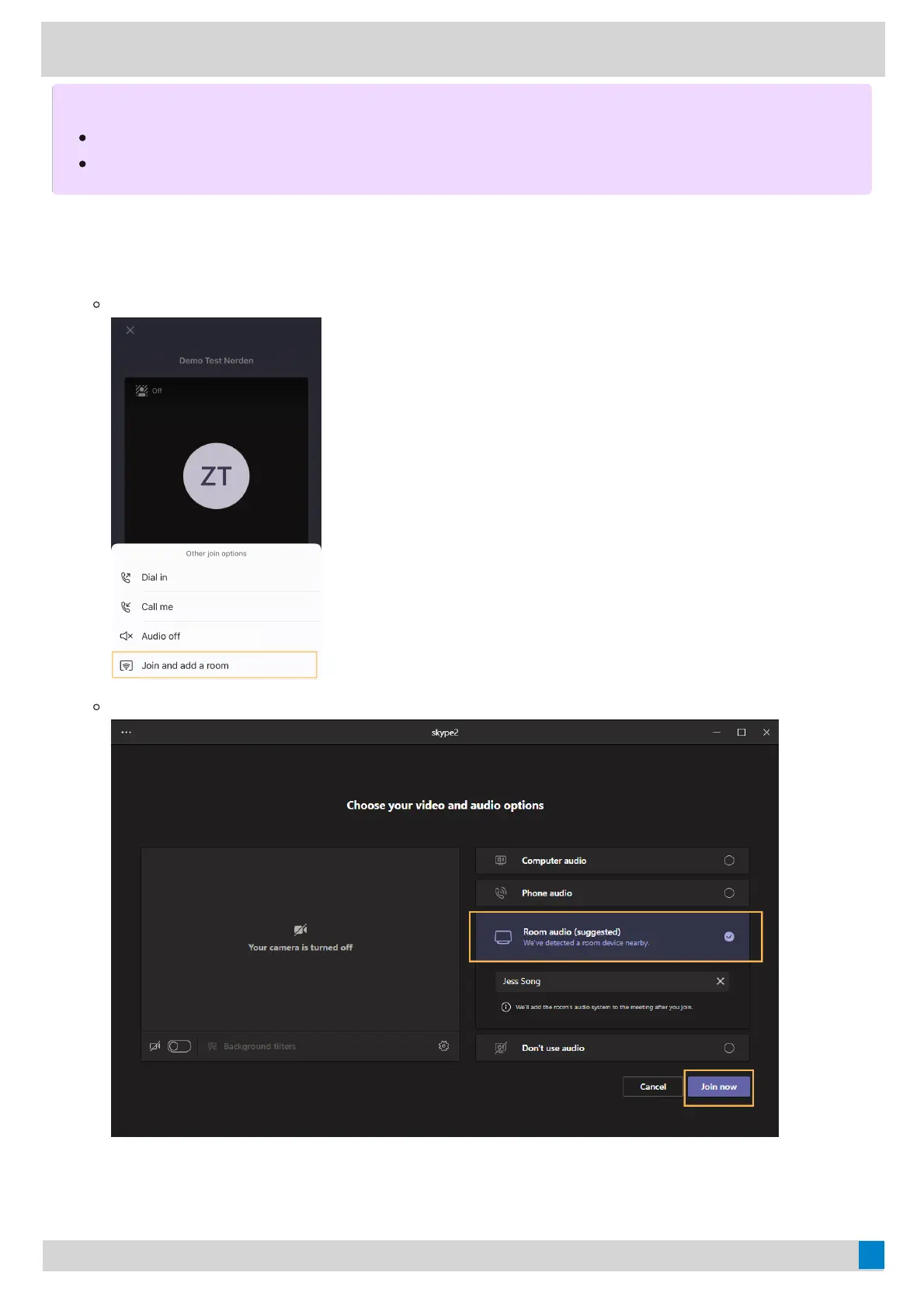 On the laptop: Select Room audio (suggested)Room audio (suggested) > Join nowJoin now.