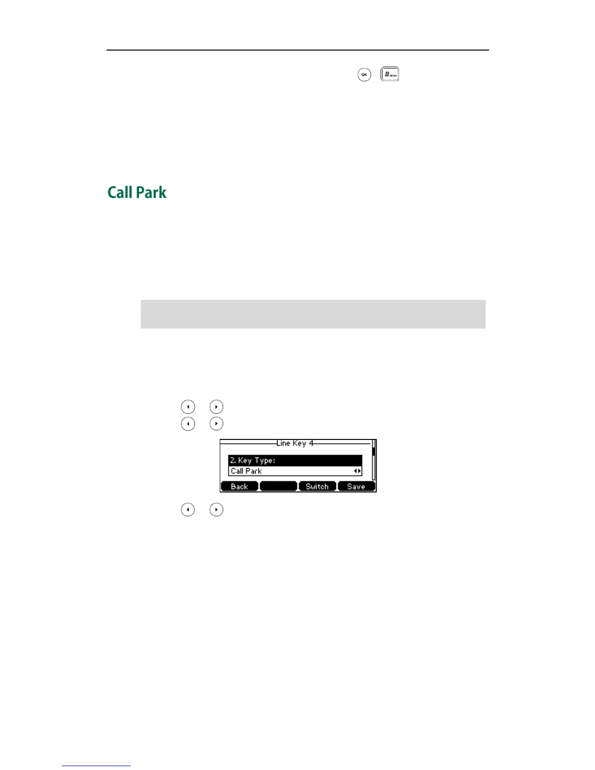 4. Press or , or the Switch soft key to select Call Park from the Key Type field.