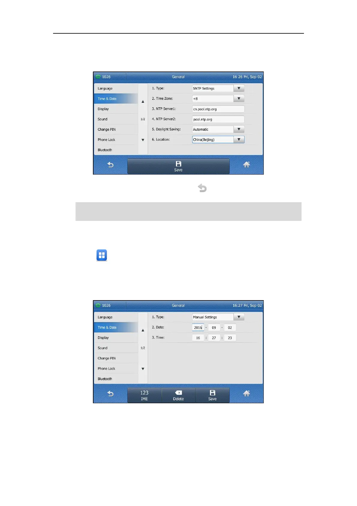 To configure the time and date manually via phone user interface: