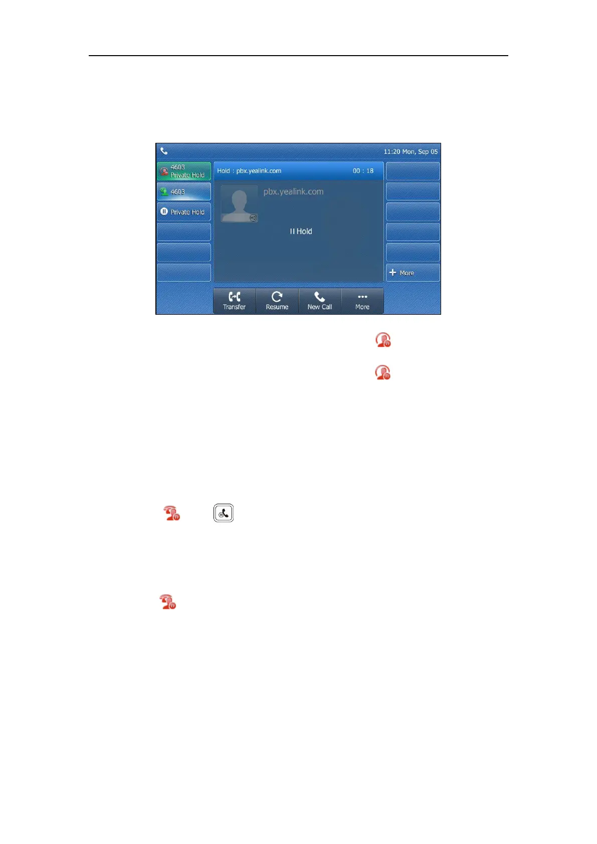 1. Tap the PriHold soft key or private hold key on phone A when there is an active call on the