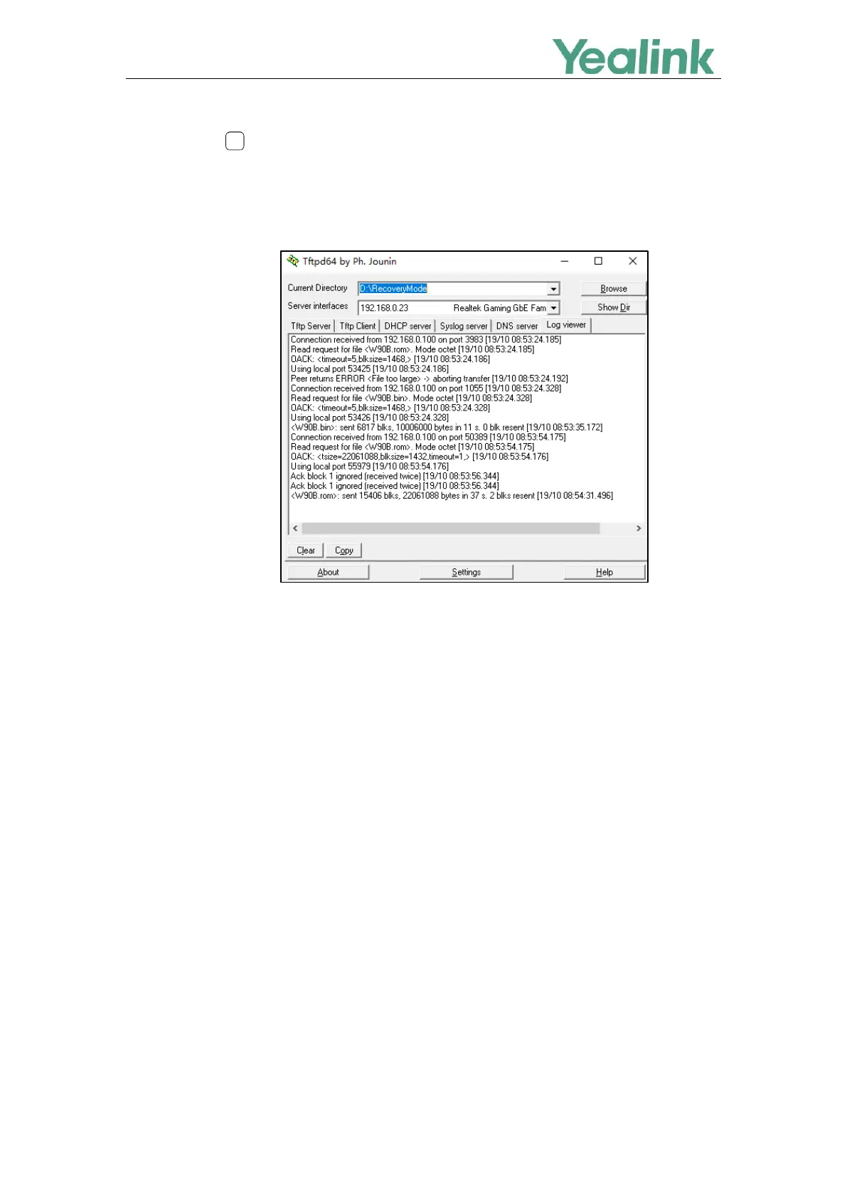 You can view the syslog of the TFTP server to check if the W90DM/W90B downloads the firmware