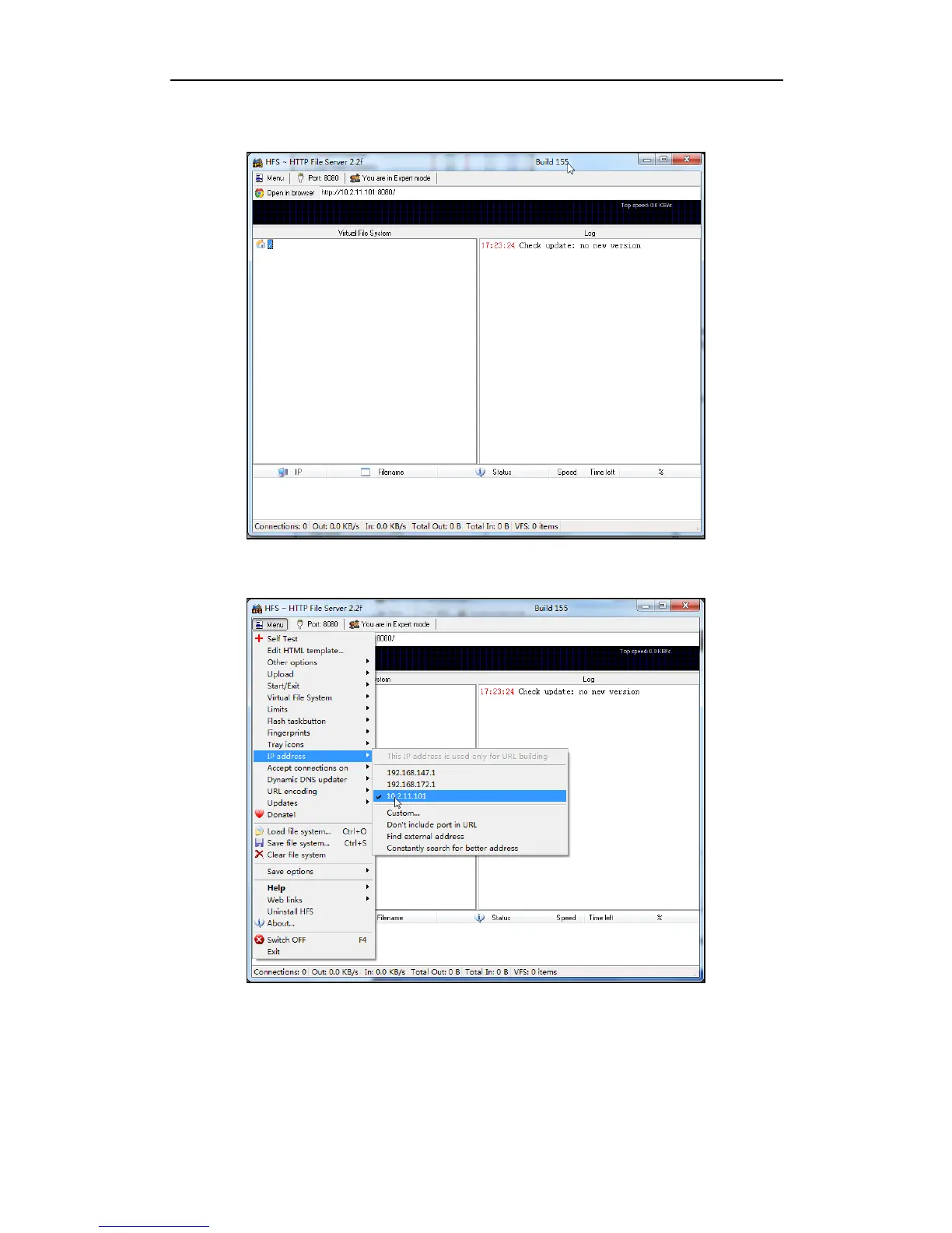 2. Click Menu in the main page and select the IP address of the PC from IP address.