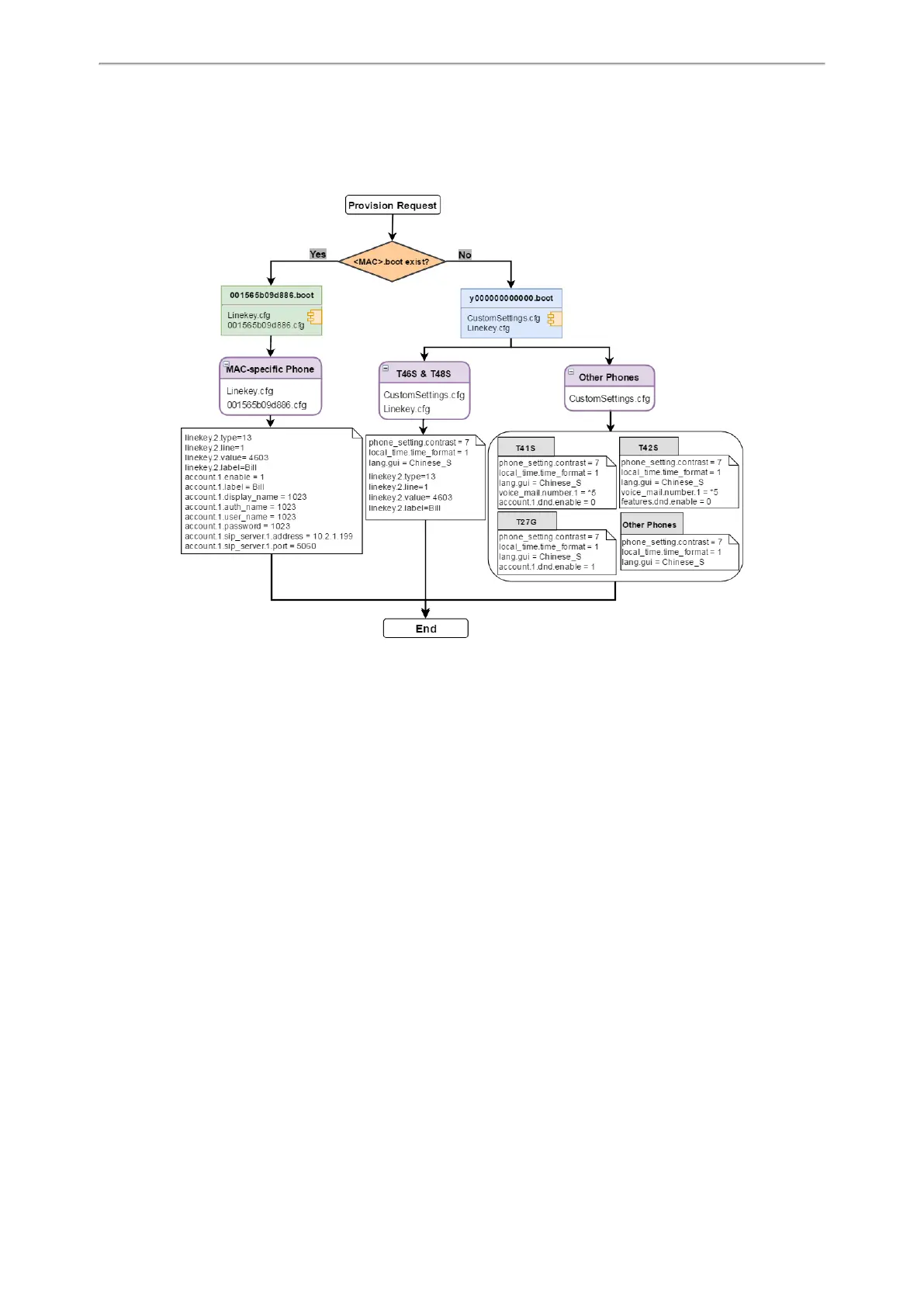 The following shows the provisioning flowchart for different phone models with phone-specific settings.