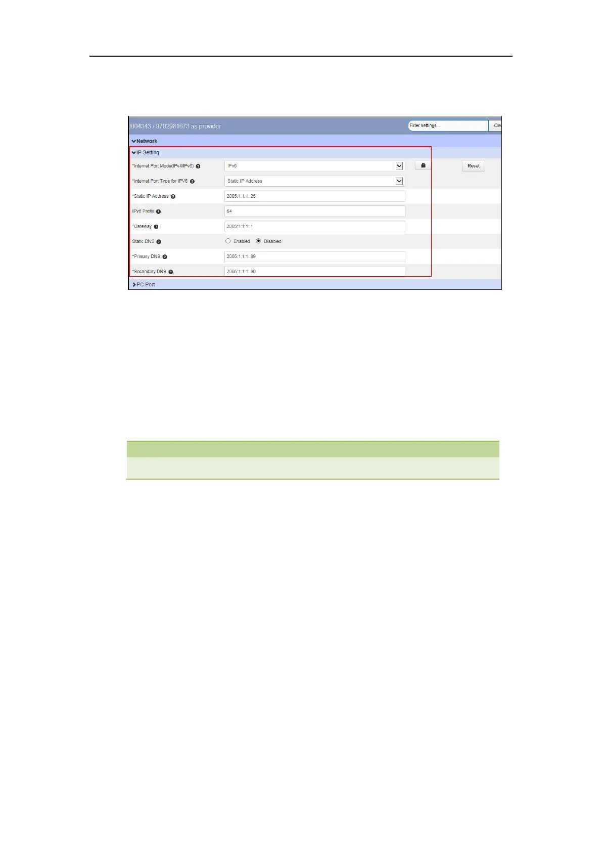 3. Enter the desired values in the Static IP Address, IPv6 Prefix, Gateway, Primary DNS and