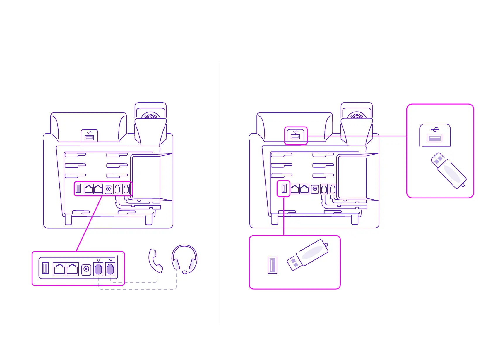 Here’s how to connect the handset and optional headset.