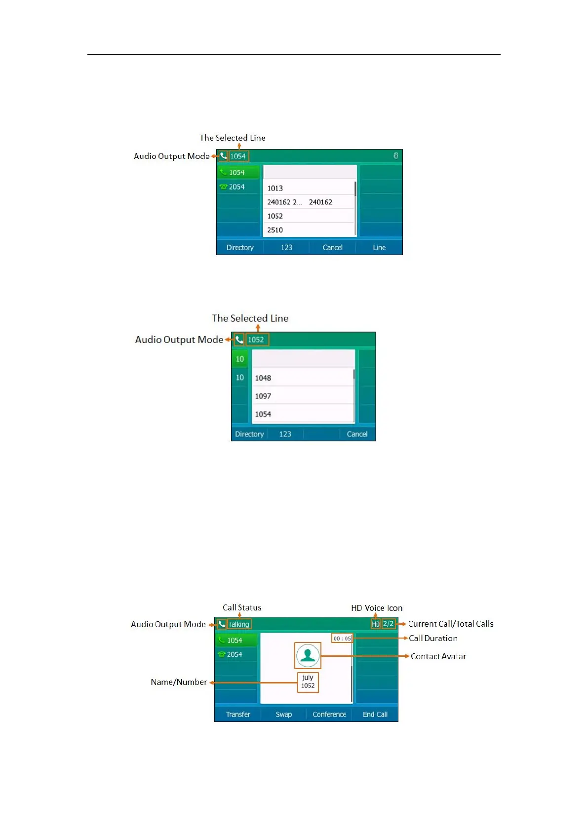 You can press up and down navigation keys to switch among calls. The following figures are the