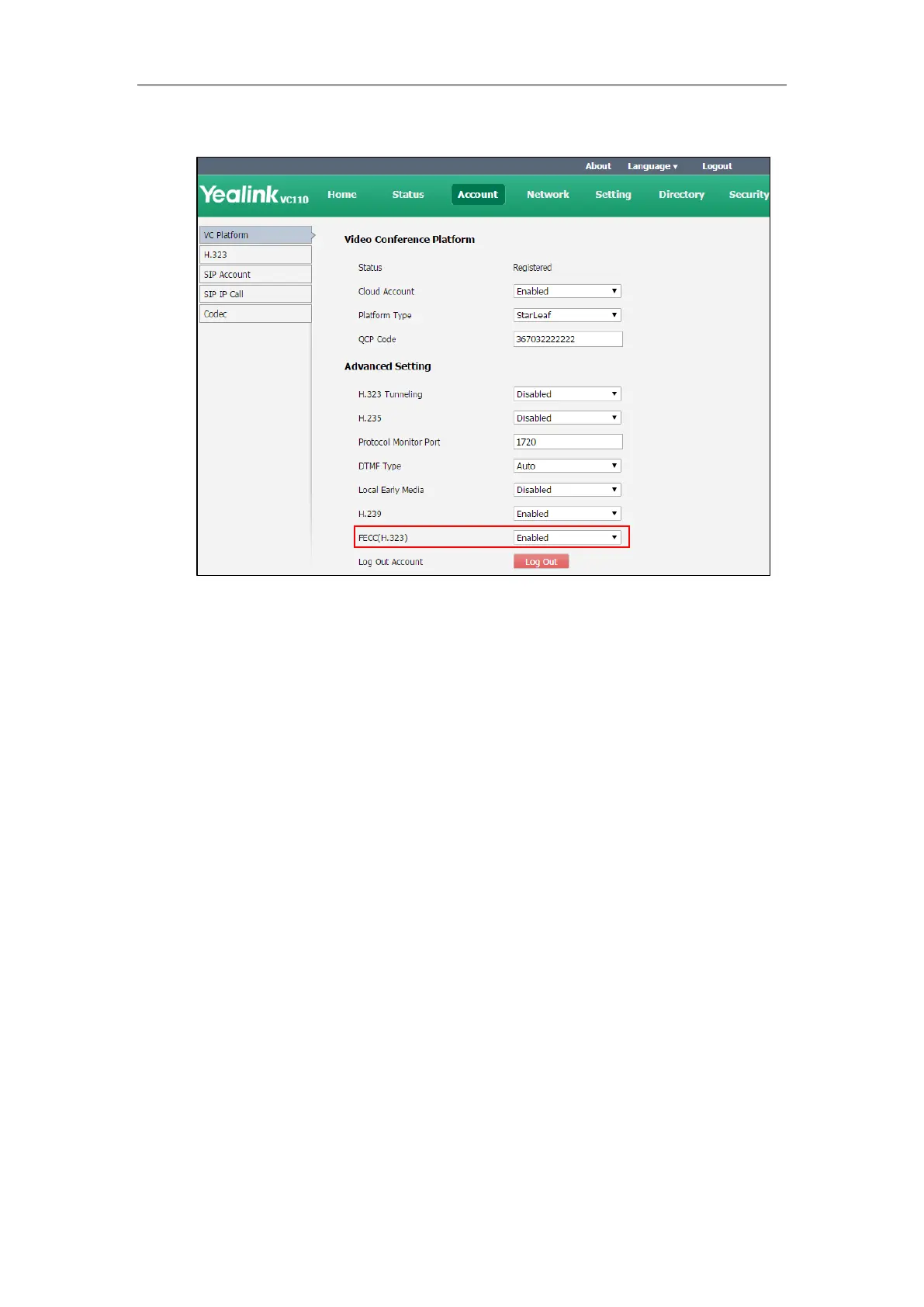 3. Select the desired value from the pull-down list of FECC(H.323).