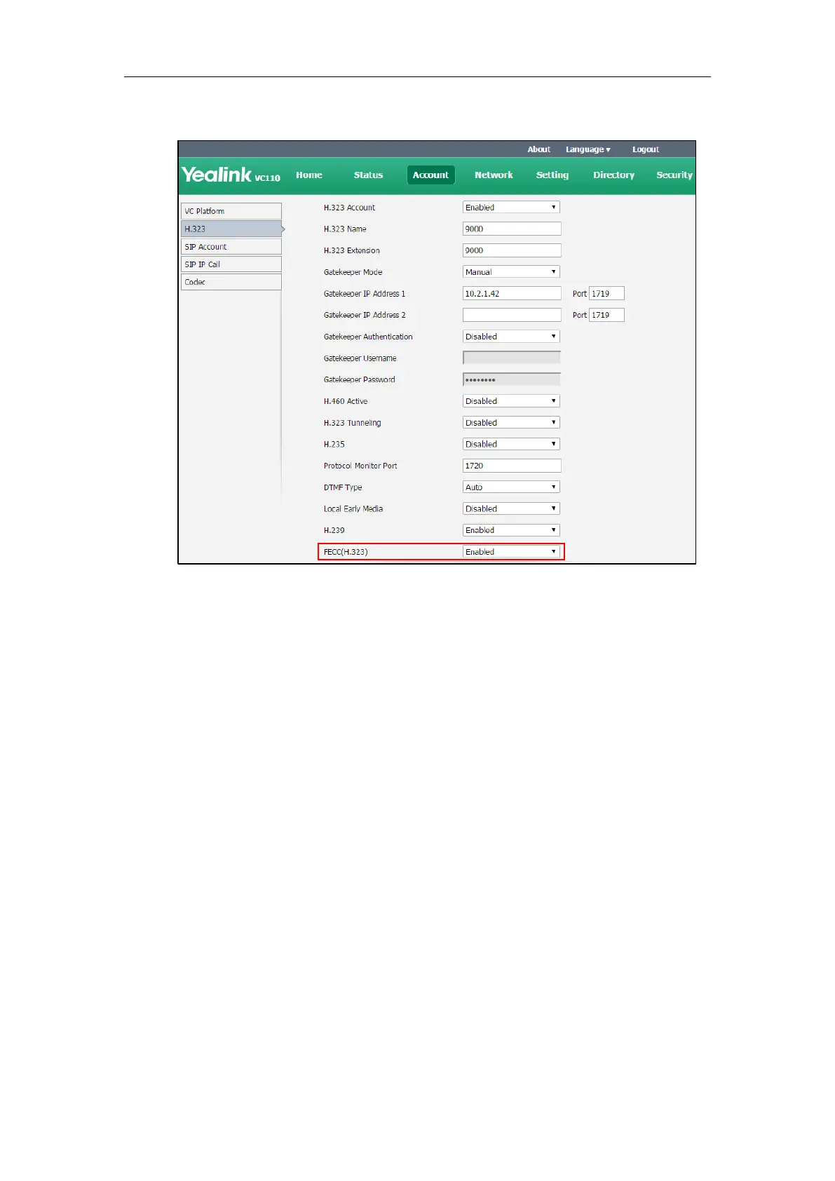 2. Select the desired value from the pull-down list of FECC(H.323).