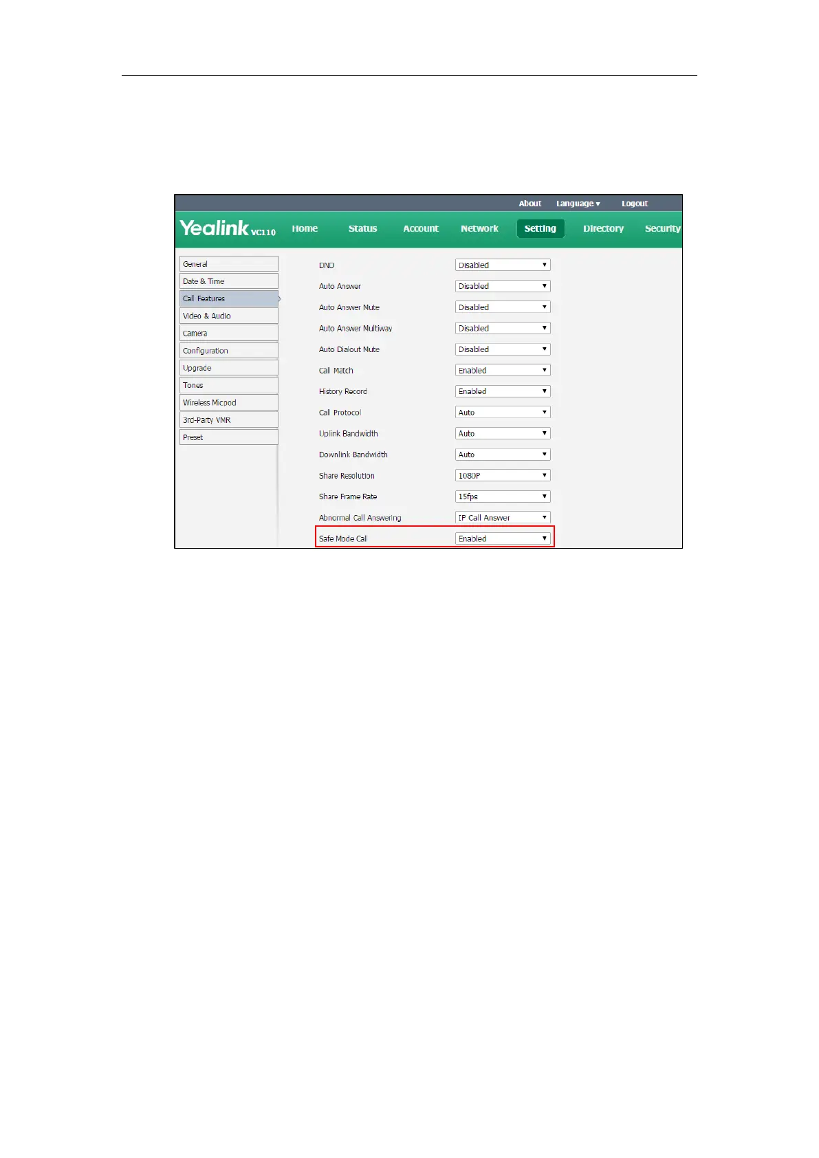 2. Select the desired value from the pull-down list of Safe Mode Call.