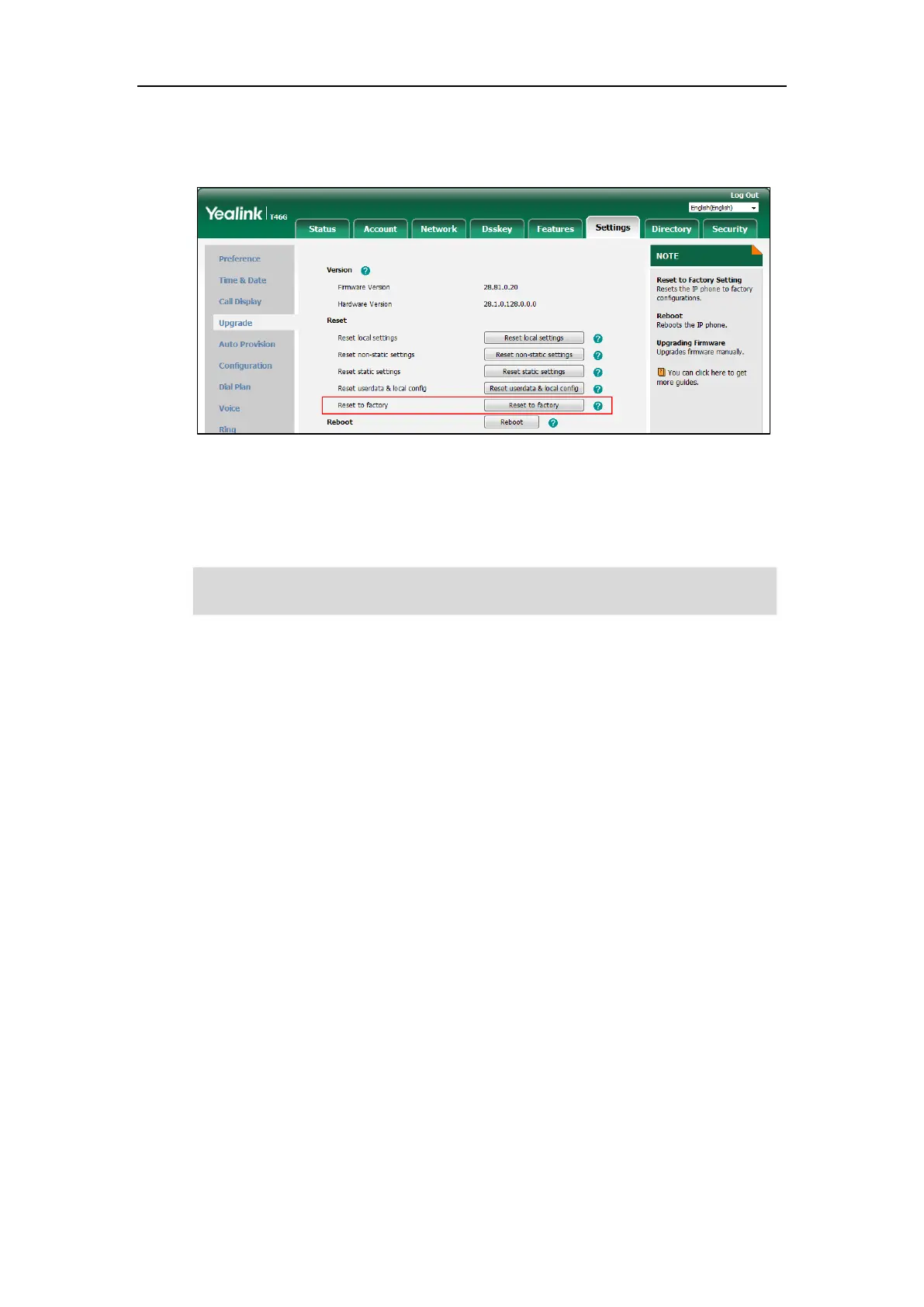 The web user interface prompts the message “Do you want to reset to factory?”.