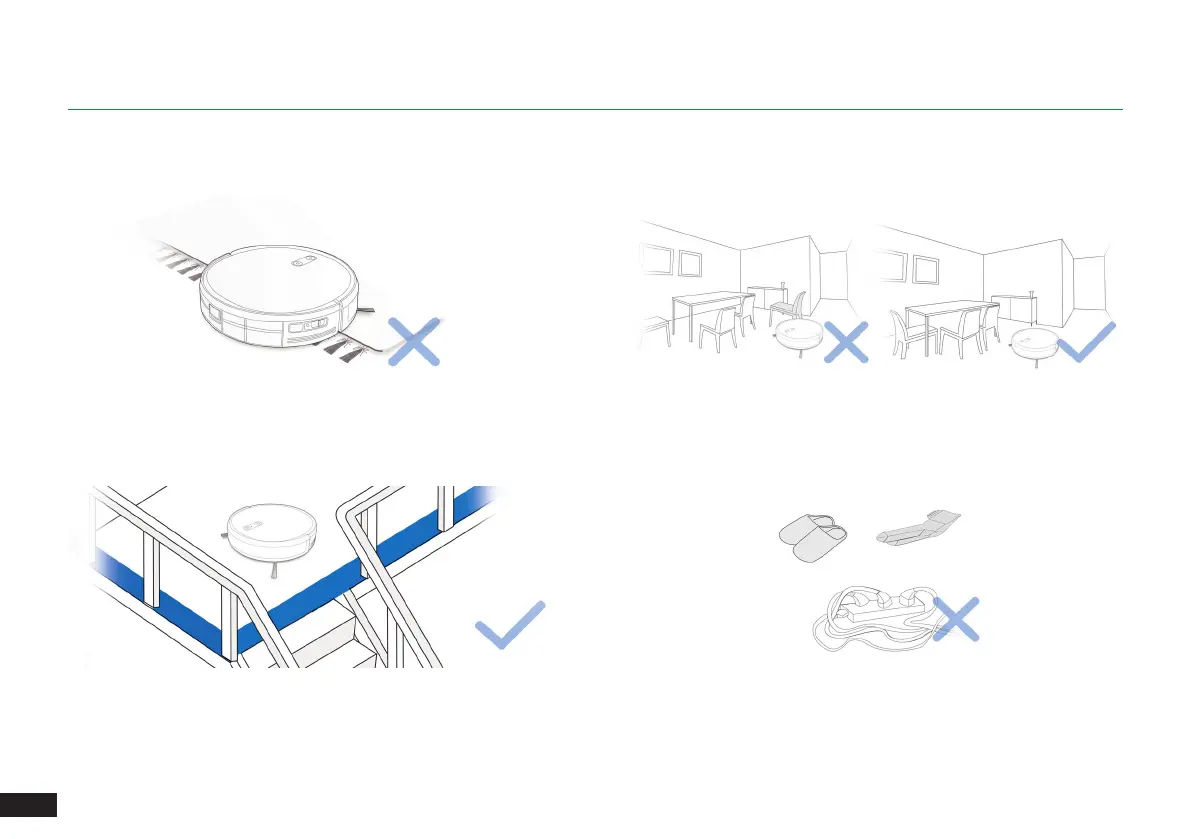Remove power cords and small objects from the oor that the robot