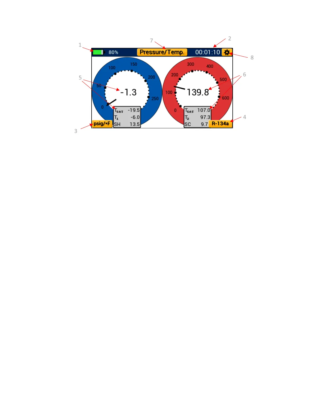 gauge. All temperature readings are conveniently displayed below each gauge as Tsat (saturation