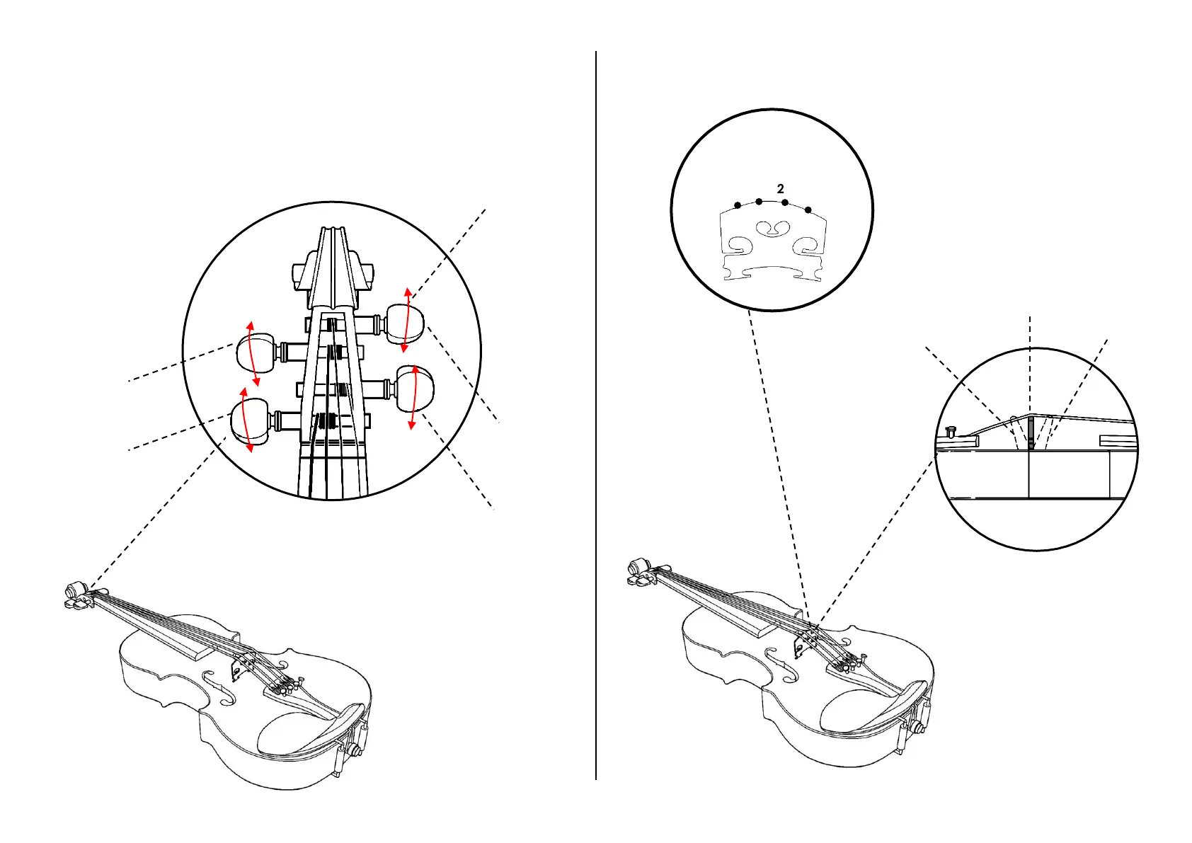 Yescom Violin - Winding Strings onto Tuning Pegs; Peg Insertion and Winding Technique; Ensuring Strings Seat on Bridge; Maintaining Bridge Alignment