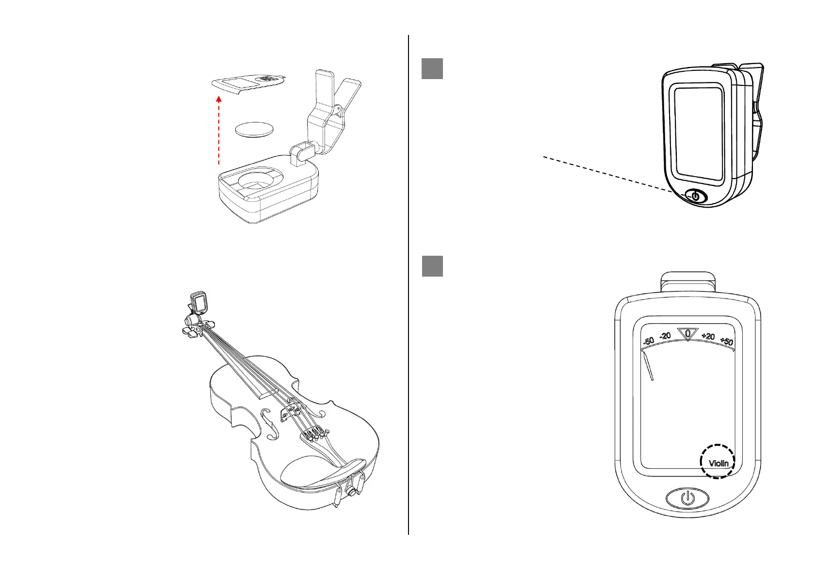 Yescom Violin - Tuner Usage; Tuner Battery Replacement; Attaching the Tuner; Turning On and Setting Tuner Mode